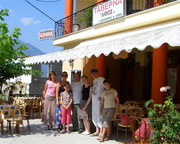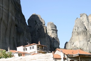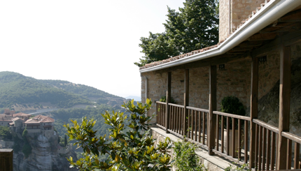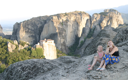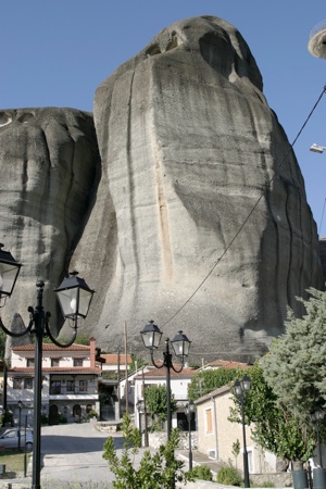 Начитавшись отзывов туристов, мы запланировали остановиться в деревне Кастраки. Это оказалось правильным решением. Проезжая сквозь соседний поселок Каламбаки, поняли, что там бы было не так уютно. Оказавшись к пяти вечера на главной площади деревни и оставив детей на качелях у храма, отправились искать жилье. Местный житель на вопрос о комнатах махнул в сторону свежепостроенного отеля, к которому пришлось перебираться через овраг. Отель был мил, но дорог и пуст. Поискав еще, прямо недалеко от площади нашли комнаты, которые нам предложила... русская девушка Наташа! Она тут замужем за греком, держат мини-отель и таверну. Оказалось, что Наташа из Питера, но уже 15 лет в Греции. Обрадовавшись, согласились на ее цену и, побросав вещи (но приняв душ) поспешили застать лучи закатного солнца на стенах древних монастырей.