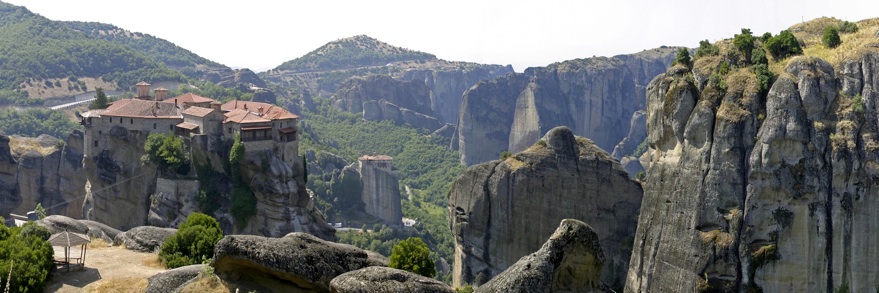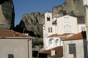 Проснувшись от ударов колокола в 7-30 (спасибо что ночью не бьют!) и отлично позавтракав в таверне, побежали к открытию монастырей. Думали будем первыми, но опоздали. В туристическом поселке Каламбаки всех туристов тоже рано поднимают. В 9-00 уже стояли ряды автобусов. Так как у нас было всего полдня, посмотрели главный монастырь и, объехав весь район с другой стороны, зашли в женский, с цветочками.