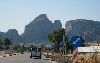 Последнюю часть пути проехали по равнине наперегонки с местной электричкой. Создалось впечатление, что проезжаем через сельскохозяйственное сердце Греции. Правда, то здесь, то там в чистом поле, практически в колосившейся ржи, попадались новенькие автосалоны Ауди, БМВ и огромные супермаркеты. И вот вдали показались столбы из скал. Получилось еще 200 км.